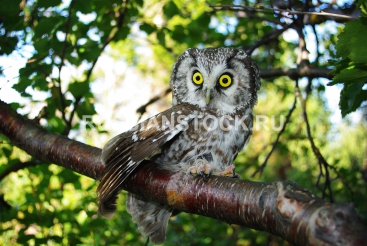 Сова, хищная птица. Owl (Aegolius funereus) on a tree branch in different poses