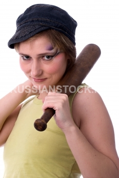 Молодая женщина с ярким макияжем и битой