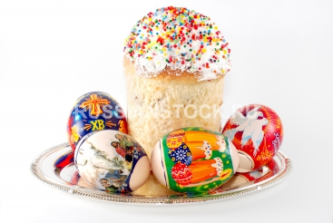 Пасхальные яйца и куличи, Easter eggs are photographed on a silver dish