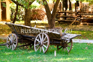 Старая деревянная телега, The old cart with a wicker basket stands on a farm