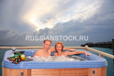 Пара в джакузи на фоне моря, Men and woman in jacuzzi on background of ocean, water villa, Maldives