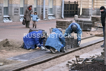 Рабочие выкладывают плитку.
