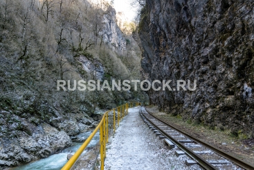 The railway in the mountain gorge goes along the river bank