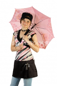 Девушка с розовым зонтом на белом фоне.