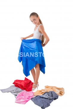 The girl tries on multi-colored fabric