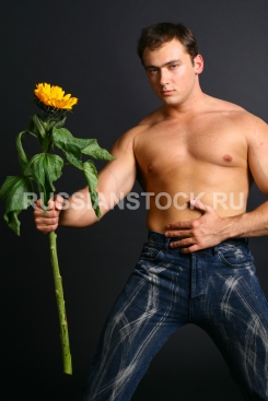 Портрет юноши атлетического телосложения держит в руках подсолнух