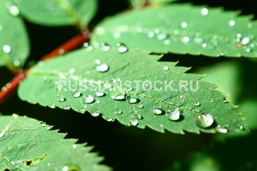 Капли росы на зеленом листе крупным планом