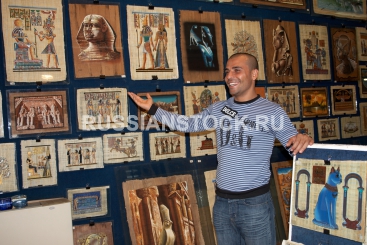 Продавец демонстрирует товар в магазине сувениров