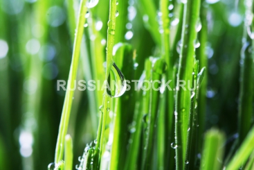 Зеленая сочная трава с крупными каплями росы