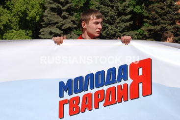 Мужчина держит плакат с надписью "Молодая гвардия"