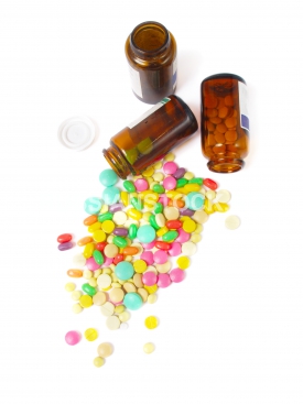 Различные таблетки и бутылочки из под лекарств