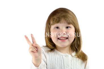 Портрет счастливой девочки Little girl with Wild eyes showing victory sign isolated on white.
