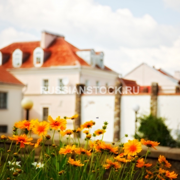 Маргаритки перед домом daisies in front of house at summer day.