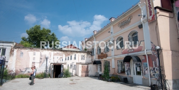 Улан-Удэ, ул. Ленина, 24б, август 2013. Двор в исторической части города. Кофейня "Инталия", отель "Меньшиковъ", Траттория, пункт проката.