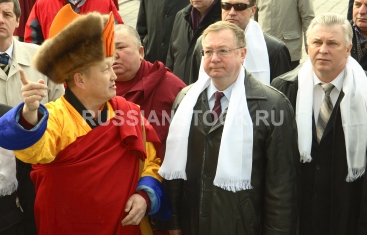 Глава буддистов России Пандидо Хамбо лама Дамба Аюшеев, председатель счетной палаты РФ Сергей Степашин, президент Бурятии Вячеслав Наговицын /слева-направо/