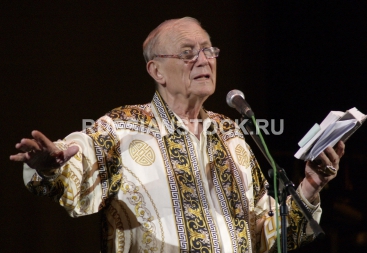 Поэт Евгений Евтушенко на своем юбилейном вечере в рок-опере "Идут белые снеги".