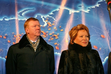 Анатолий Чубайс, председатель РАО "ЕЭС России", и Валентина Матвиенко, губернатор Санкт-Петербурга, на открытии новой правобережной ТЭЦ-5 в Санкт-Петербурге.