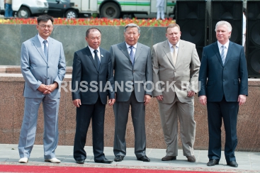 Улан-Удэ. Церемония вручения выпускникам школ золотых и серебряных медалей. На снимке: Алдар Дамдинов, министр образования и науки, Цыденжап Батуев, депутат Хурала, Геннадий Айдаев, мэр Улан-Удэ, Сергей Шилин, федеральный инспектор, Вячеслав Наговицын, президент Республики Бурятия.