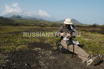 Турист на фоне Ключевской сопки (Ключевской вулкан) - действующий вулкан на востоке Камчатки, наиболее высокий (4750 м) активный вулкан в мире
