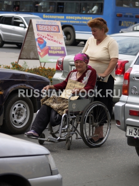 Женщина в инвалидной коляске просит милостыню у водителей автомобилей.