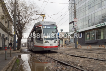Краснодар, апрель. Работа городского общественного транспорта. Трамвай идет по маршруту №6 по улице Горького.